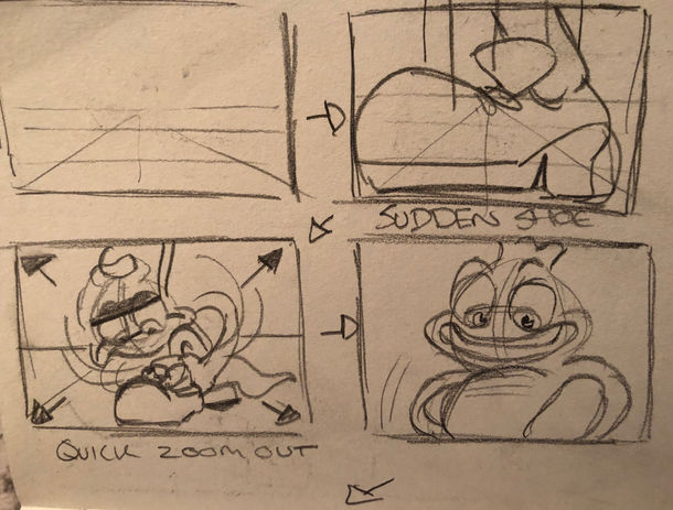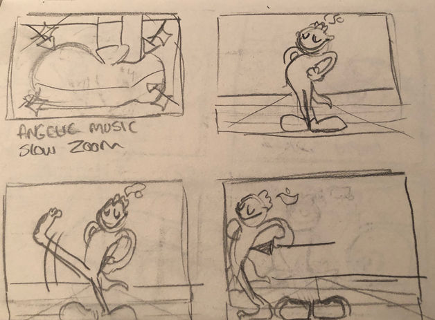 The idea for this animation is inspired by 1930's slapstick humour. A lot of it is squash and stretch and so he only has traces of bones. The candle on his head shall flicker throughout the animation.